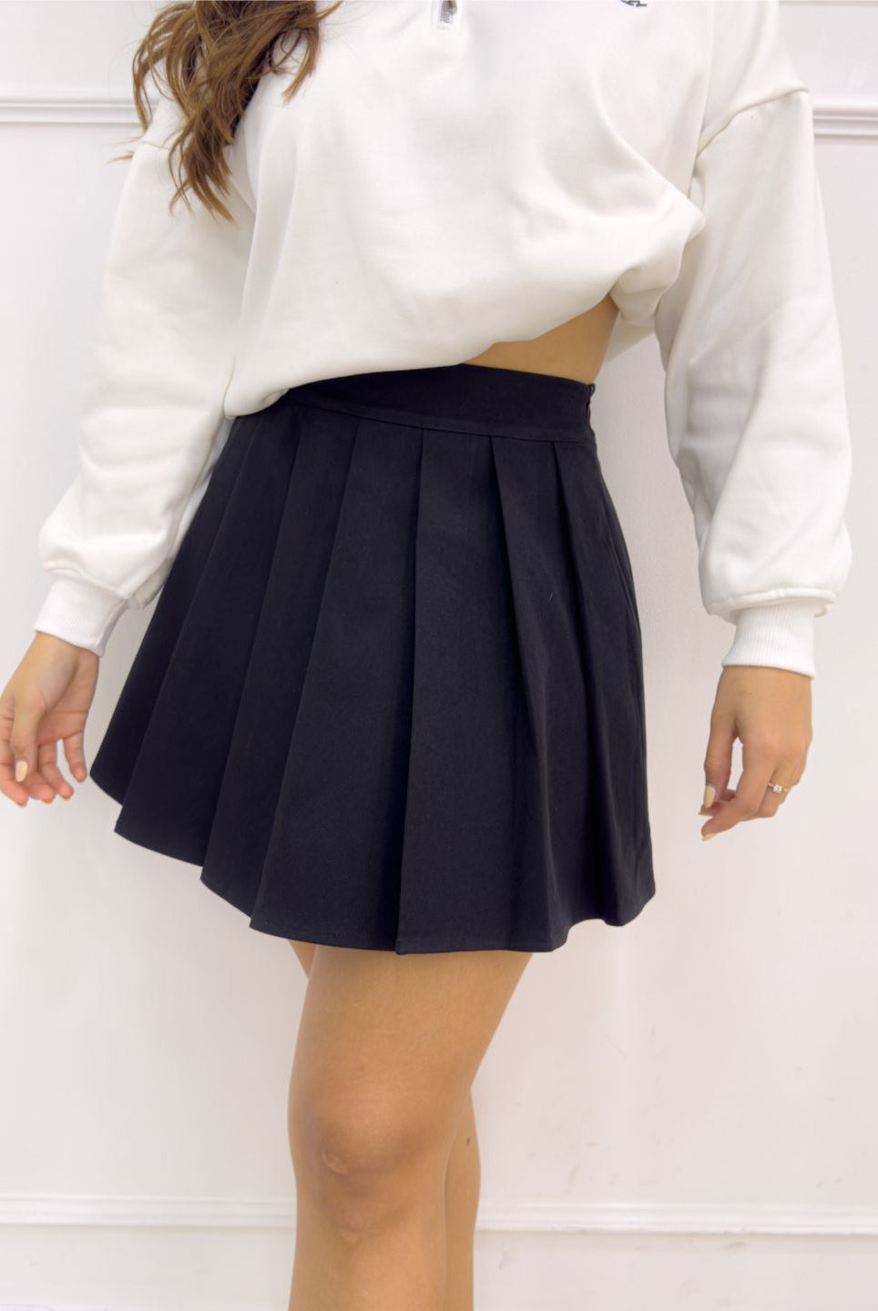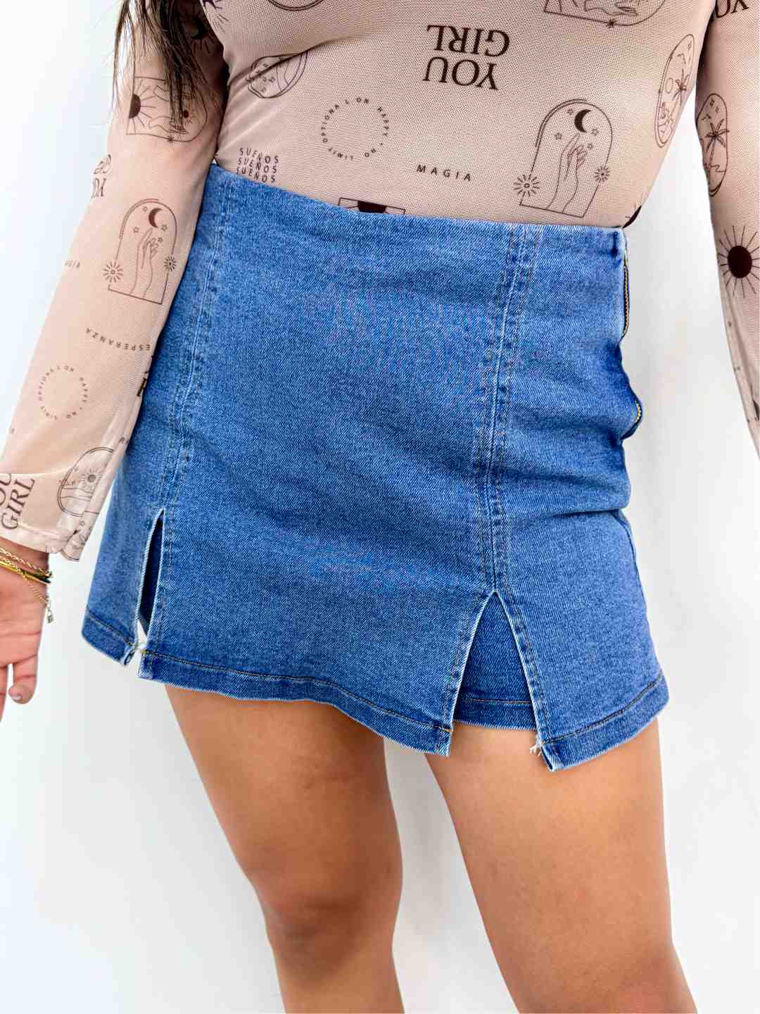 -Falda short con tapa frontal con aberturas laterales, elaborado en denim con cremallera lateral.