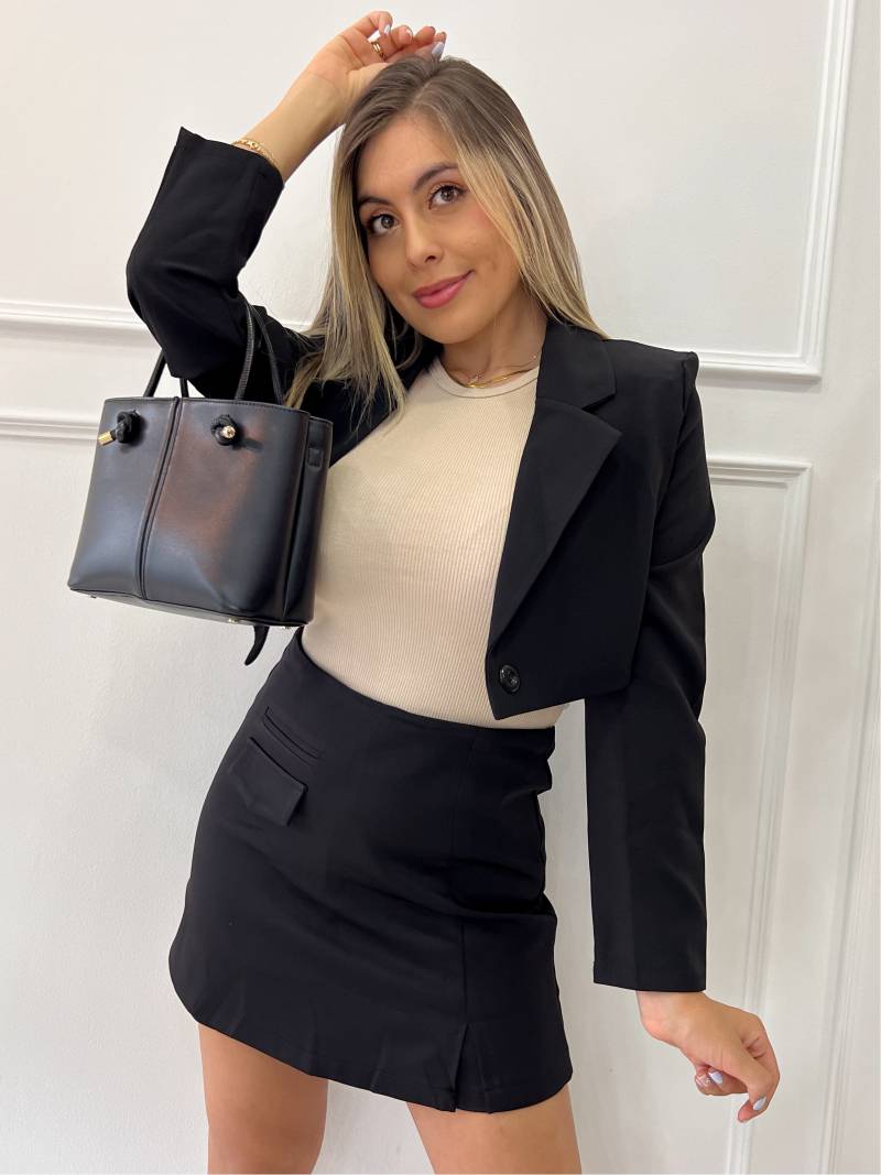 -Falda Short con abertura a un costado y falso bolsillo con solapa para darle mas estilo.