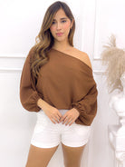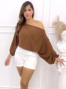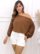 -Atrévete a un look sofisticado con nuestra blusa marrón de un hombro para mujer con mangas abullonadas, confeccionada en tela ligera y fresca que aporta comodidad y movimiento.