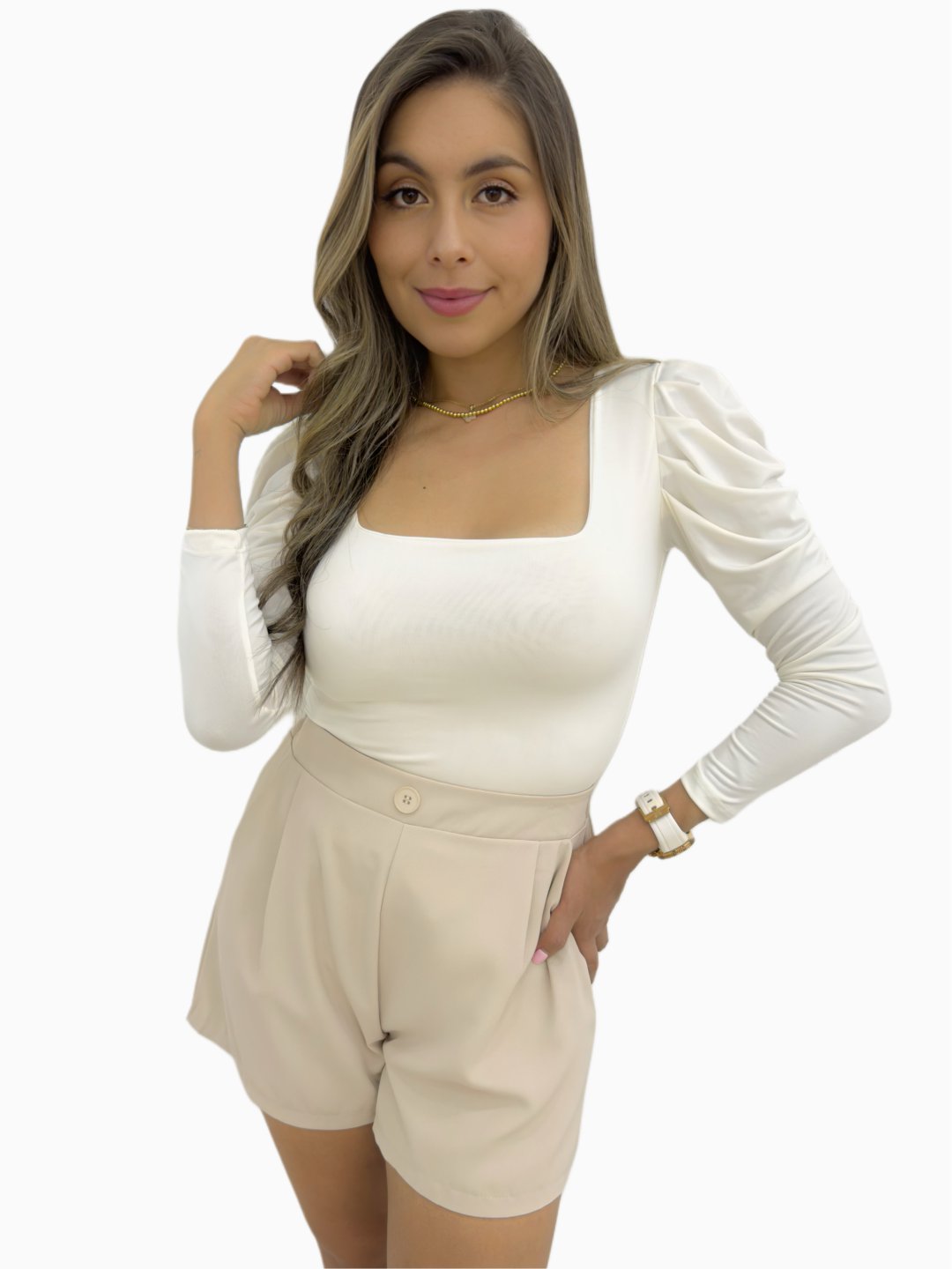 -Body manga larga bombacha con escote cuadrado elaborado en acetato DOBLE TELA, de silueta ajustada y terminación en tanga con gafete. Ref. B097