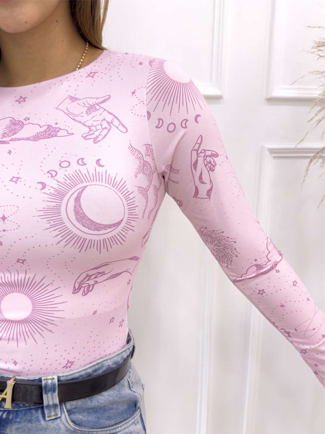 Destaca tu estilo con este body de manga larga estampado astral. Su diseño lleno de soles, lunas y constelaciones crea un look moderno y auténtico que no pasará desapercibido.