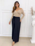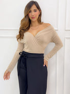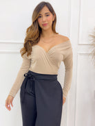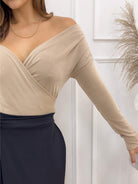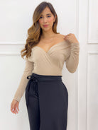 -Aporta sensualidad y elegancia a tu look con nuestra blusa arena para mujer con escote cruzado off shoulder, diseñada en tela suave y elástica que se adapta perfectamente a tu figura.