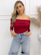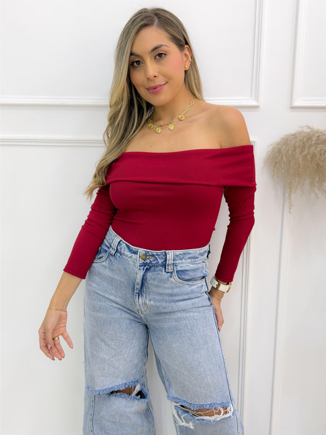 -La blusa Vinotinto bandeja para mujer es una prenda elegante y atemporal que realza los hombros y el cuello con un diseño femenino y sofisticado.