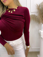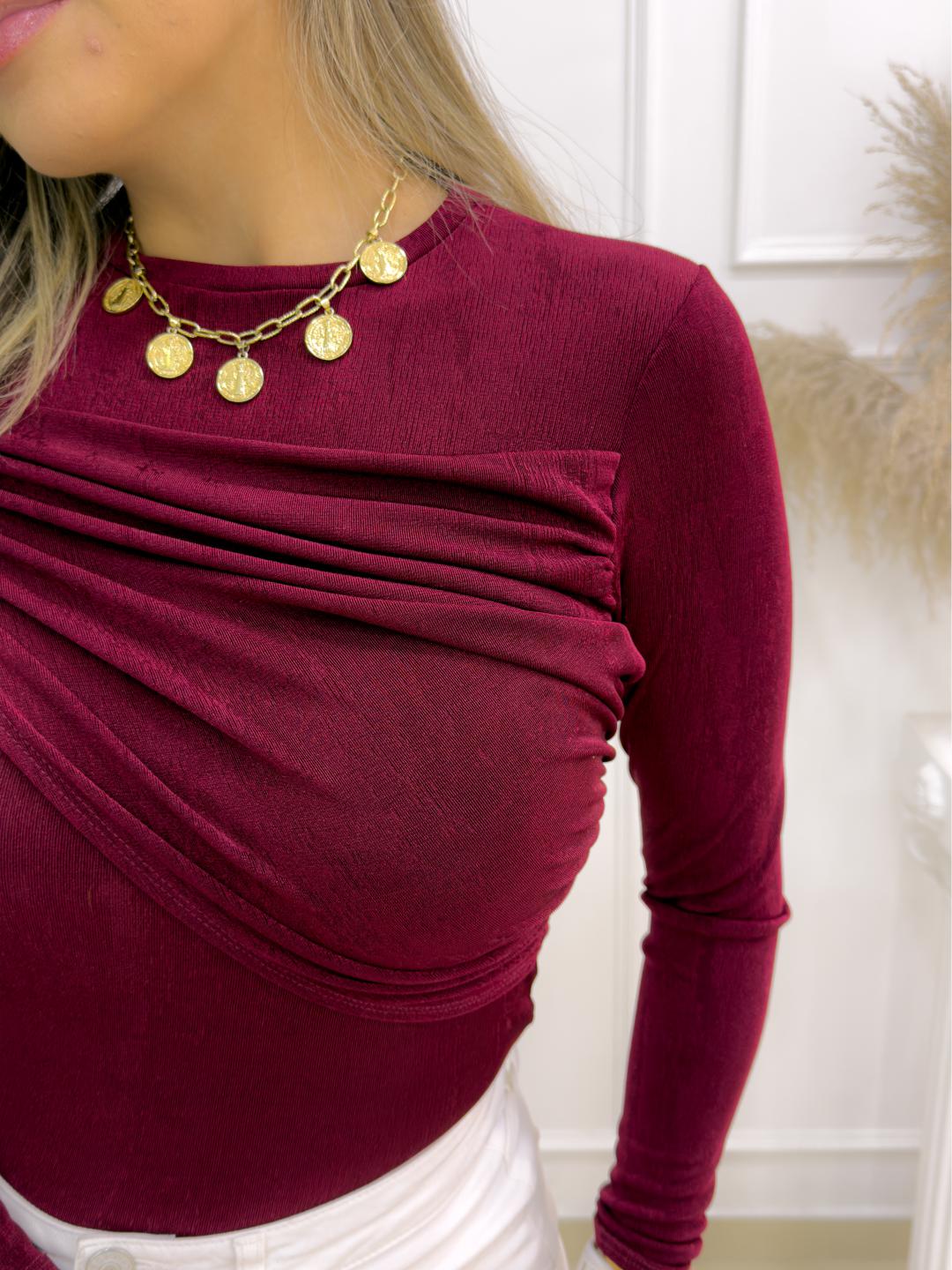 -La blusa Vinotinto con recogido frontal es la prenda ideal para lograr un look elegante, delicado y muy femenino. Su diseño con drapeado en el pecho estiliza visualmente la figura, mientras que la tela suave con ligero destello aporta un toque sofisticado perfecto para cualquier ocasión.