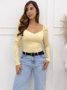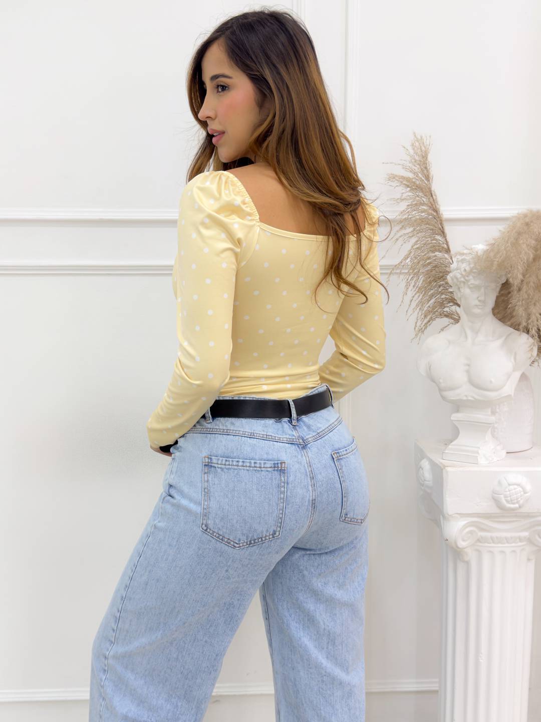 -Aporta un toque dulce y femenino a tu look con nuestra blusa amarilla pastel con lunares blancos.
