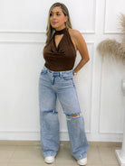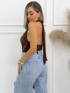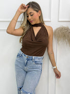 -La Blusa Halter Café con Escote Drapeado es una prenda sofisticada, femenina y perfecta para elevar cualquier look casual o elegante. Su diseño halter con abertura frontal estiliza hombros y cuello, mientras que el escote drapeado aporta un efecto suave y favorecedor que realza la figura sin esfuerzo.
