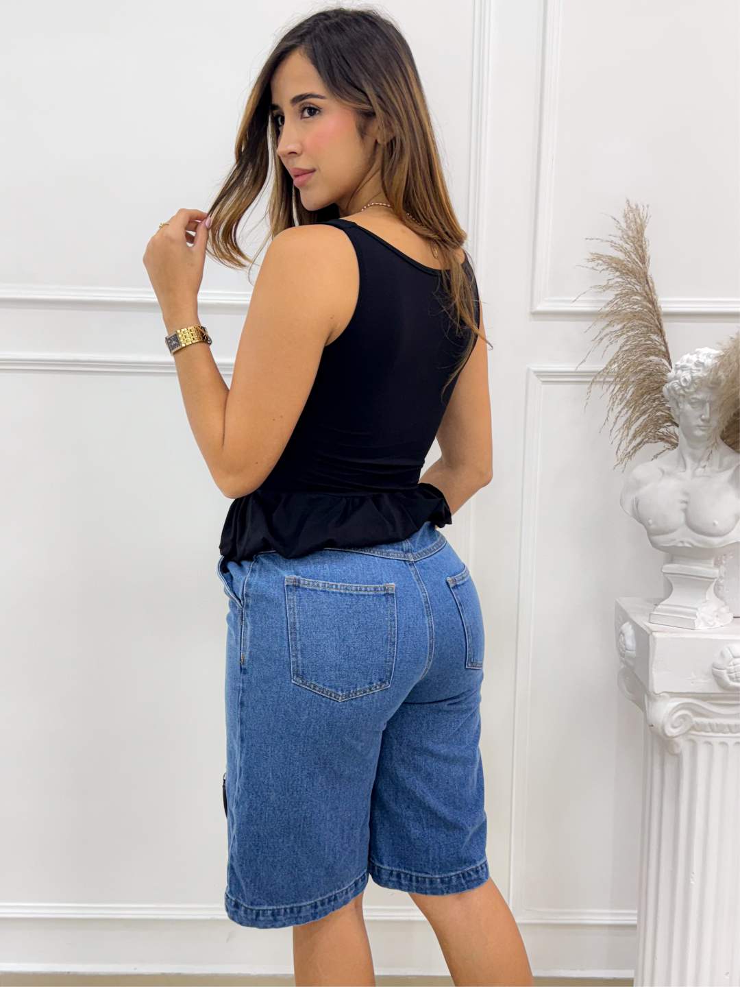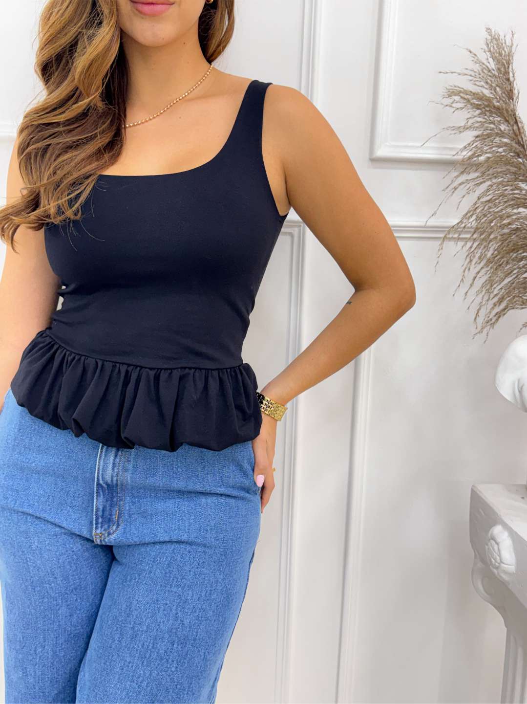 Define tu cintura y eleva tu look con esta blusa negra peplum para mujer, diseñada para estilizar la figura de forma elegante y femenina.