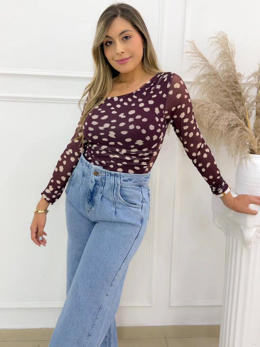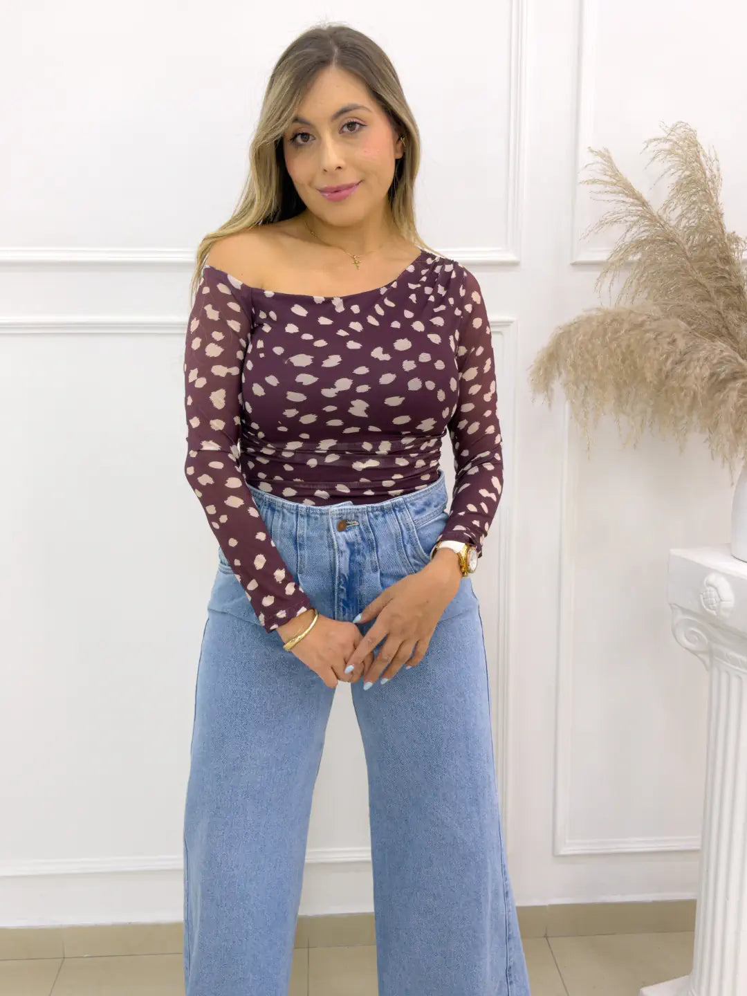 -Este body en mesh con estampado bambi print combina sensualidad sutil y sofisticación moderna a través de su diseño asimétrico que deja un hombro al descubierto.