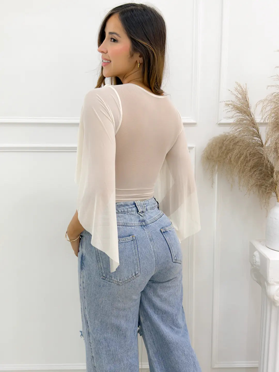 -Las mangas fluidas en tela translúcida crean movimiento y ligereza, logrando un balance perfecto entre sutileza y presencia.