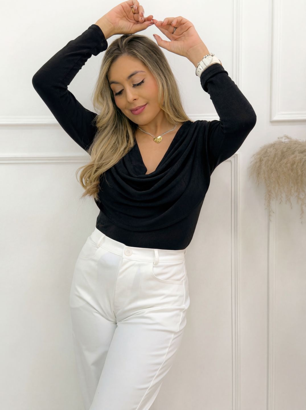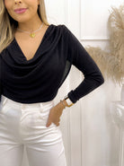 -Eleva tus looks con nuestro Body Negro de escote drapeado, una prenda elegante, femenina y con un toque sofisticado que transforma cualquier outfit. Su diseño de caída suave en el pecho realza la figura sin esfuerzo, mientras que las mangas largas aportan estilo y comodidad.