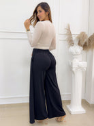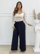 Eleva tu outfit con nuestro pantalón negro tipo pareo con lazo lateral, una prenda elegante y versátil que estiliza visualmente la figura gracias a su corte de tiro alto y caída fluida.