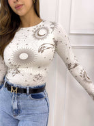 Destaca tu estilo con este body de manga larga estampado astral. Su diseño lleno de soles, lunas y constelaciones crea un look moderno y auténtico que no pasará desapercibido.